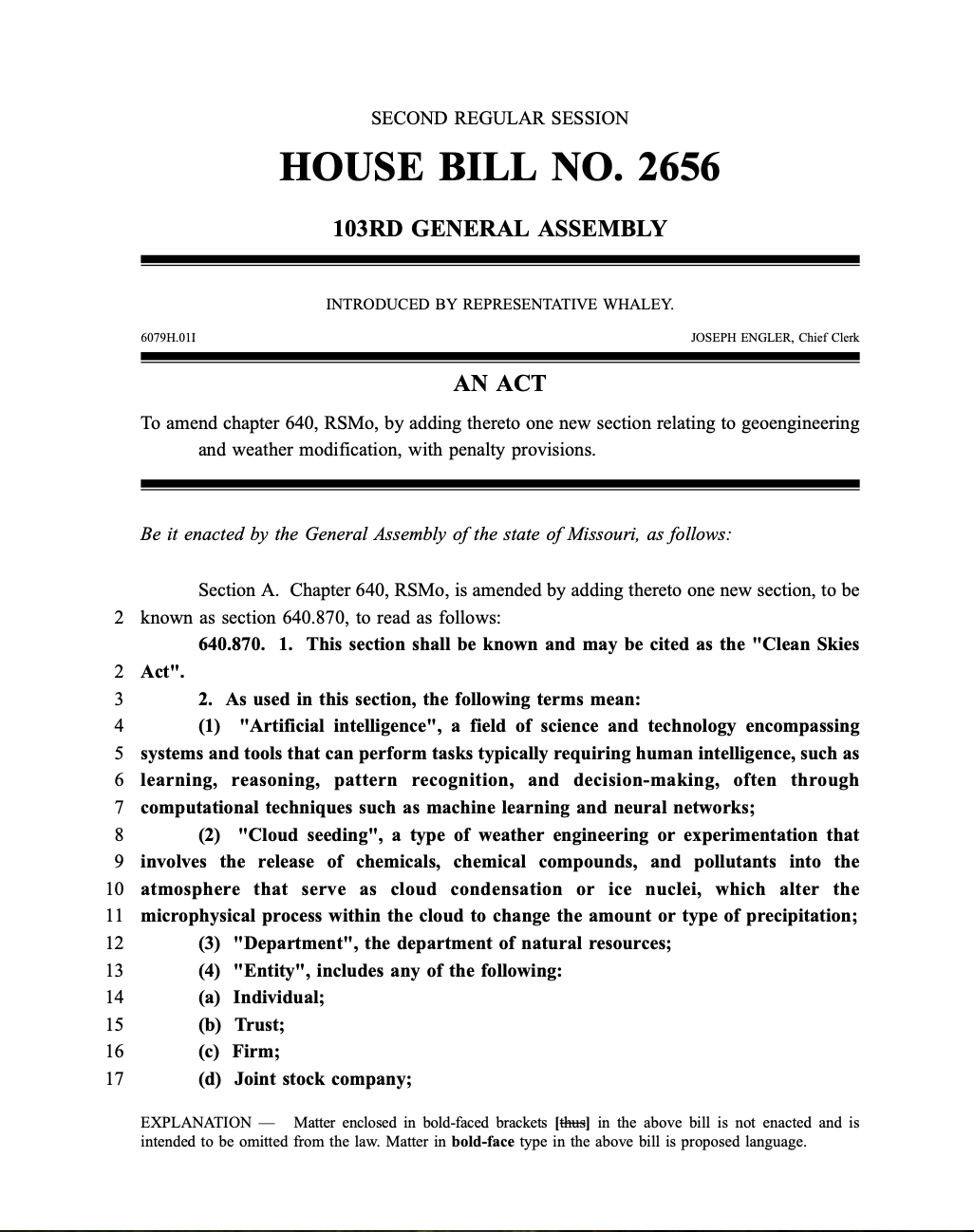 You might simply say, “My name is ____ and I am from ____ Missouri and I am asking you to support SB860 banning Geoengineering and Weather Modification. Thank you.”